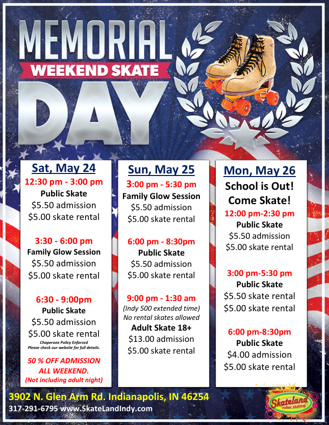 Memorial Day Weekend Skate! May 23 Memorial Day Weekend Skate! Featured May 23, 2025 @ 6:00 pm - May 26, 2025 @ 8:30 pm