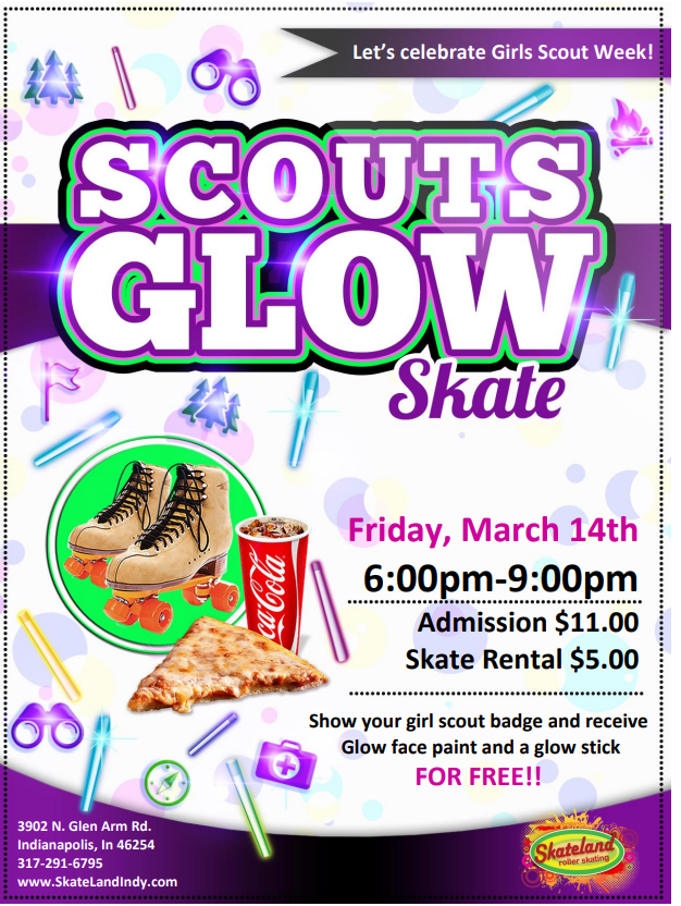 Girl Scout Week: Girl Scout Glow Skate Mar 14 Girl Scout Week: Girl Scout Glow Skate Featured 6:00 pm - 9:00 pm