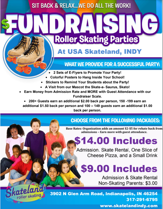 Raise funds for your school, group, or church while you skate! We’ll provide all the marketing pieces so all you have to do is spread the word and show up. Choose from one of our packages below and contact us to get your fundraiser set up. We do all the work and you have all the fun!