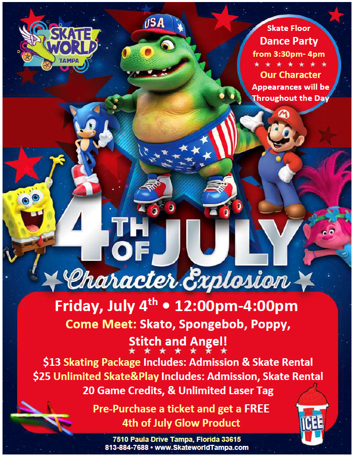 Meet Skato, Spongebob, Poppy, Stitch and Angel at our Character Explosion 4th of July Skate Party! Character Appearances Will be Throughout the Day and Ending with a Dance Party on the Skate Floor from 3:30pm-4pm! Purchase Your tickets in Advance for a FREE 4th of July Glow Item!