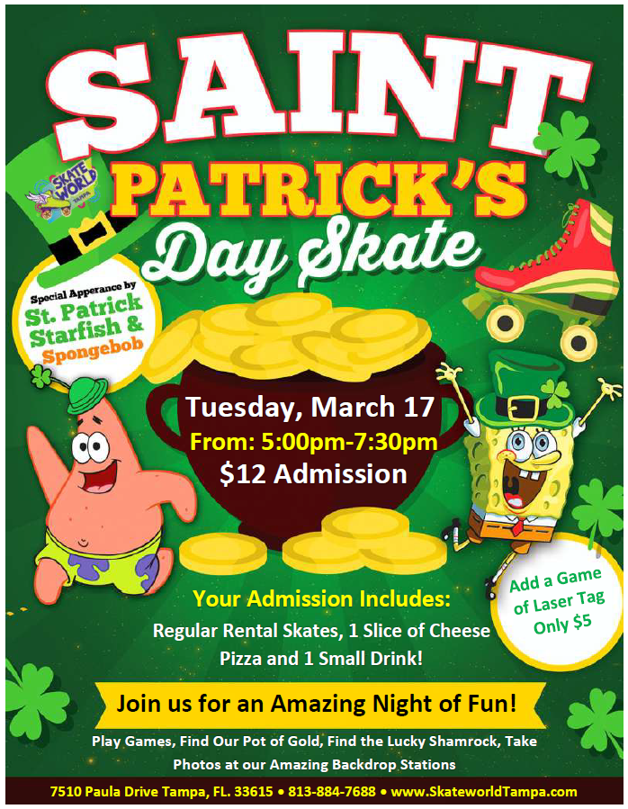 Admission: $12 Includes Regular Skate Rental, 1 Slice of Cheese Pizza and 1 Small Drink!