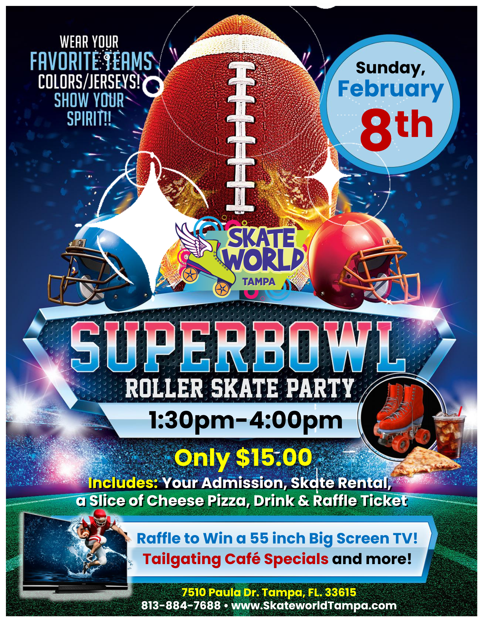 Admission: $15 Includes Regular Skate Rental, 1 Slice of Cheese Pizza, 1 Small Drink and 1 Raffle Ticket for our TV Giveaway!