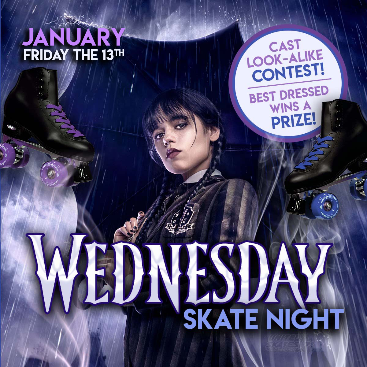 Buy Tickets Now - Selling Out Soon It’s Friday the 13th! Celebrate with us & check out all things Wednesday! Costume Contest, skating, dancing & more! $11 Admission $5 Skate Rental Purchase Tickets Here