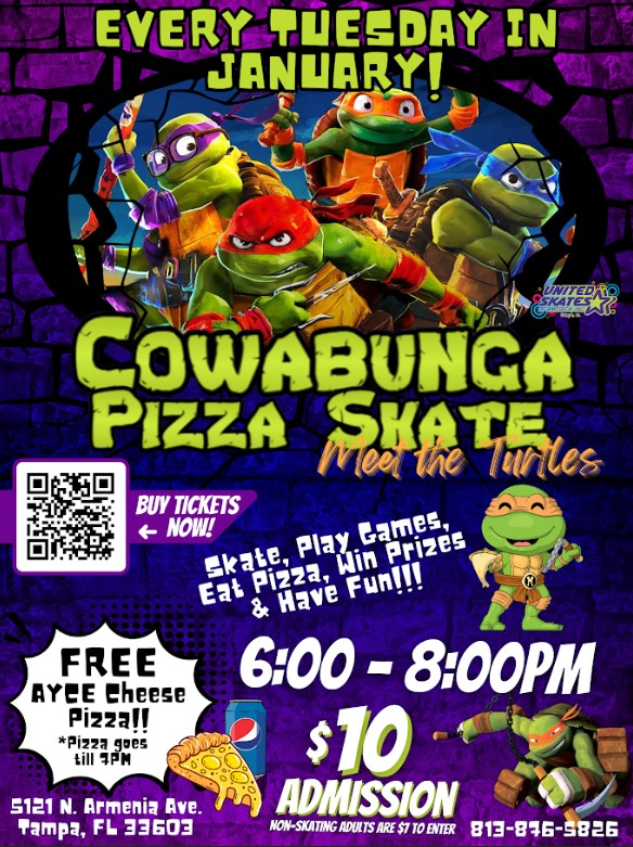 $10 per person – includes skate rental, plus all the delicious cheese pizza you can eat (served until 7:00pm) and visits from the Turtles!