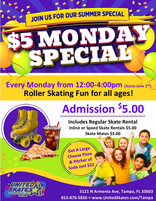 It's Our Monday Summer Special Featuring $5 Admission Includes regular skate rental Have Lunch Wit Us... Get A Large Cheese Pizza & Pitcher Of Soda For Just $22