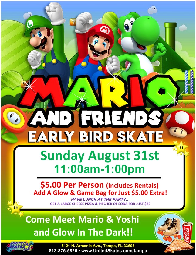 Join Mario & Yoshi For A Special Early Bird Glow Skate! Admission Just $5.00 Per Person (includes rentals) Have Lunch With Us... Get A Large Cheese Pizza & Pitcher Of […]