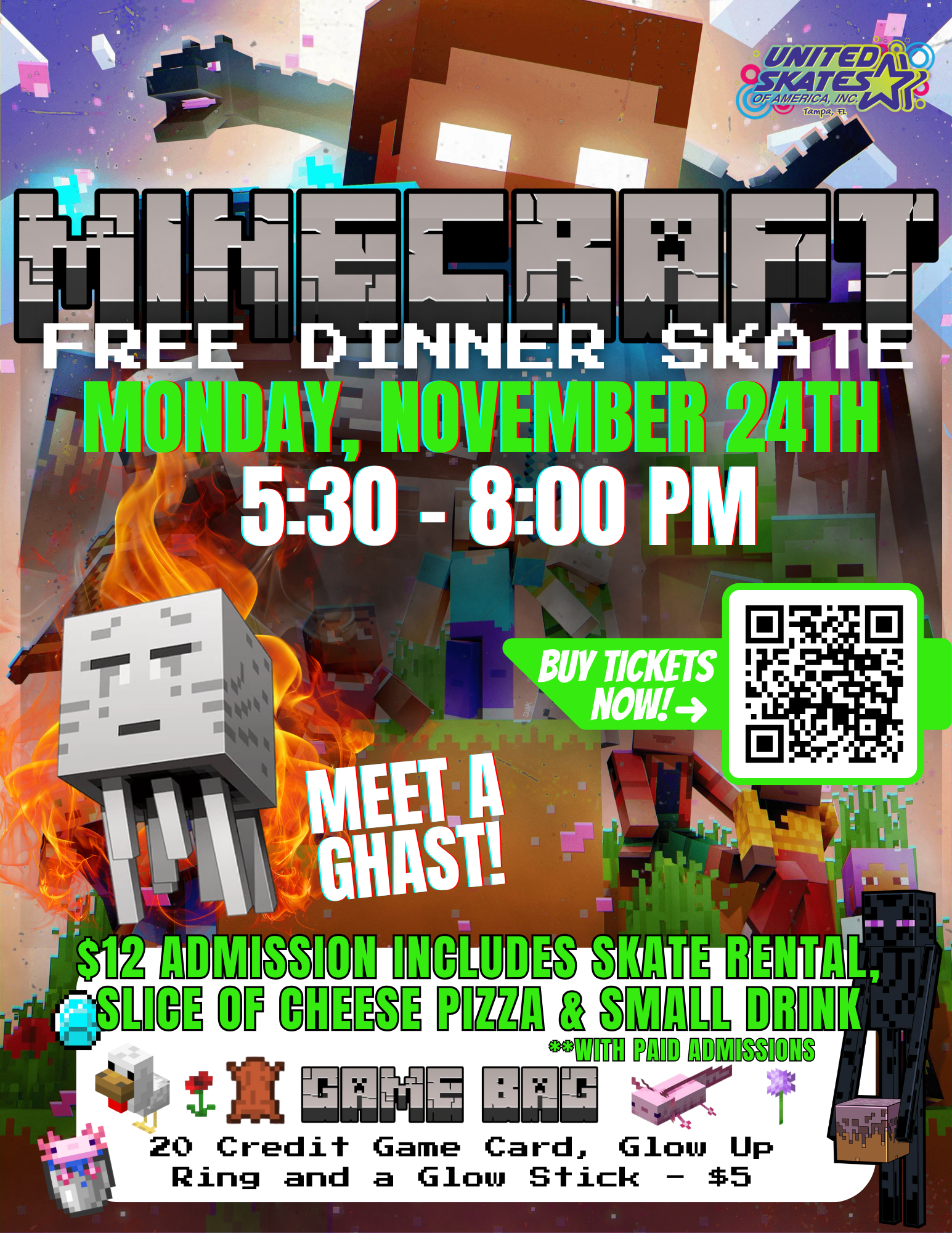 Meet A Ghast At Our Minecraft Special! $12 per person includes rentals, plus a slice of delicious cheese pizza and a small soda Non-skating parents are free Birthday Parties available […]