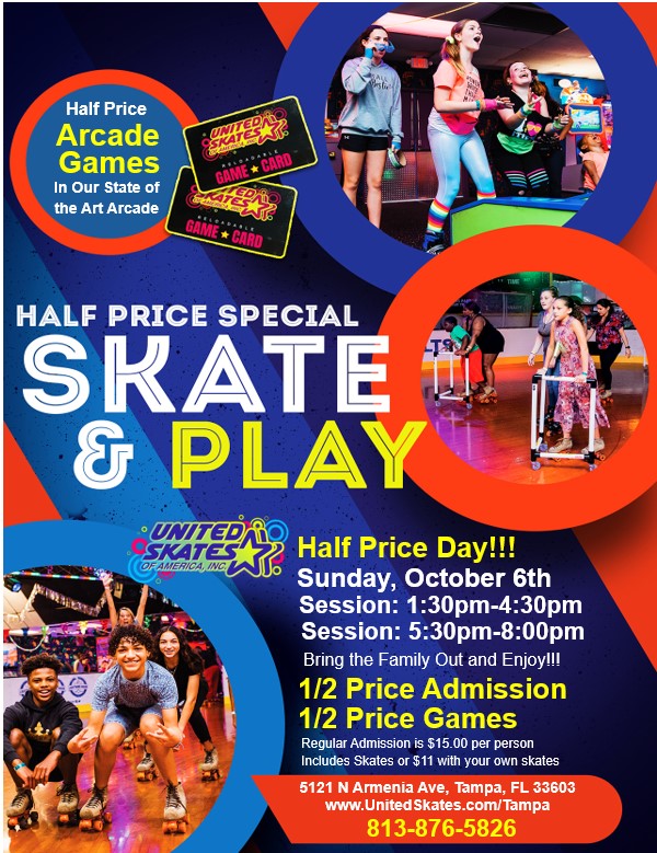 Enjoy Half Price Admission And Half Price Games! One Day Only! $7.50 per person (includes skates) or $5.50 with your own skates Featuring Family-Friendly Top 40 Music Birthday parties available with advance reservation