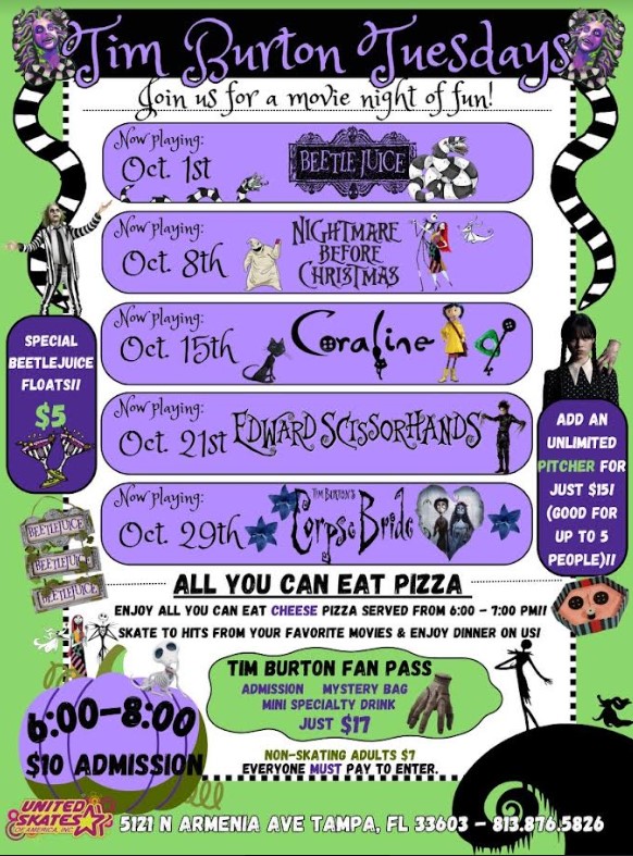 We're Celebrating All Things Tim Burton Every Tuesday Night In October! Come Skate, Enjoy All-U-Can Eat Cheese Pizza, and Watch A Different Tim Burton Movie On Our Big Screen! October 1st - Original Beetlejuice 8th - Nightmare Before Christmas 15th - Coraline 22nd - Edward Scissorhands 29th - Corpse Bride $10 per person - includes […]