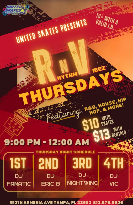 NYC's Very Own DJ Eric B Hosts Our Monthly Disco Late Skate Featuring Classic Disco And Funk Hits From The 70's & 80's Admission $13 (includes skates) or $10 if you have your own Open to ages 18 & older only with ID All guests must complete our online waiver prior to entry