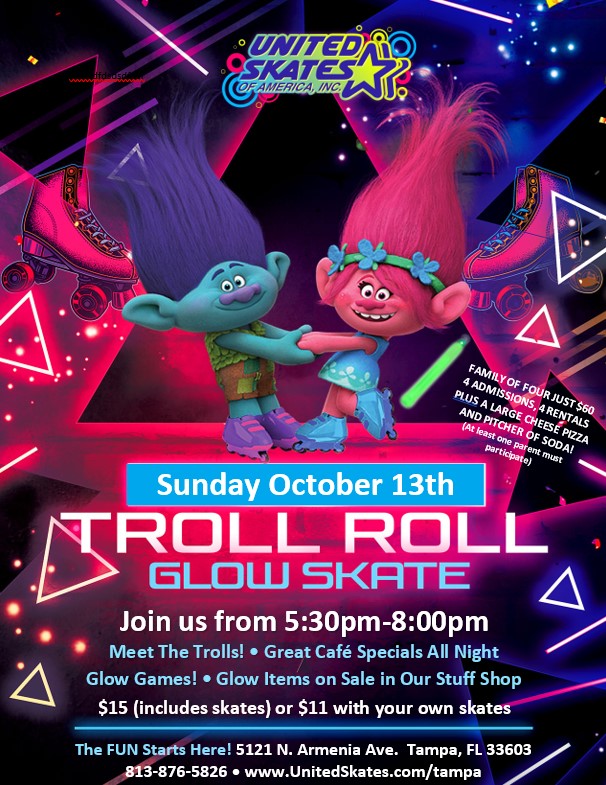 Poppy And Branch Are Here For A Special Trolls Glow Skate! There's no school on Monday, so bring the family out for Glow Fun! $15.00 per person (includes skates) or $11.00 with your own skates Featuring Family-Friendly R & B Music Family of Four Just $60 - Includes 4 Admissions, 4 Rentals, Plus a Large […]
