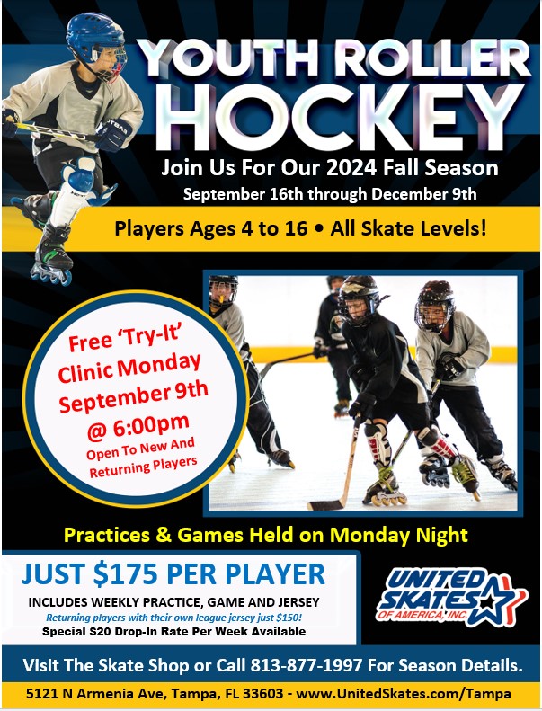 We're Kicking Off Our 2024 Fall Roller Hockey Program With A Free Try-It Clinic For Players Ages 4 To 16 Open To Interested New Or Returning Players. Regular Season Starts Monday September 16th For more details call Skaters Choice Skate Shop (813) 877-1997