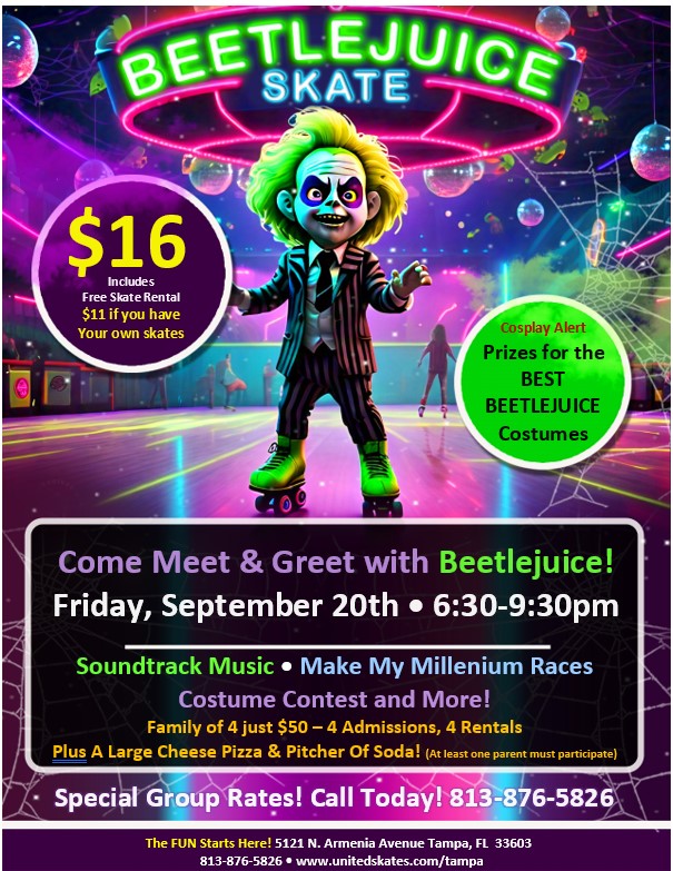 Come Meet Beetlejuice! Featuring music from the movie, along with Hot 100 hits! Beetlejuice Trivia, Millenium Races and More! $16 per person (includes skate rental) or $11 if you have your own skates All Guests ages 17 & younger without their own skates must have a parents chaperone that stays the entire time Inline or […]