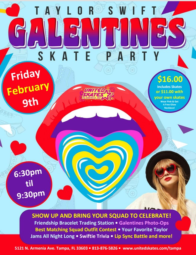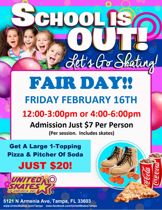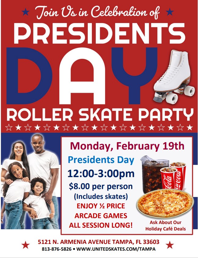 United Skates Of America Tampa 5121 N. Armenia Ave, Tampa, FL, United StatesWeeknight Skating Fun For All Ages $10 per person (includes skate rental) Family Of Four Just $50 - Includes 4 Admissions, 4 Rentals, Plus A Large Pizza & Pitcher Of Soda (At least one parent must participate) Birthday Parties & Fundraising Opportunities Available. Call For Reservations