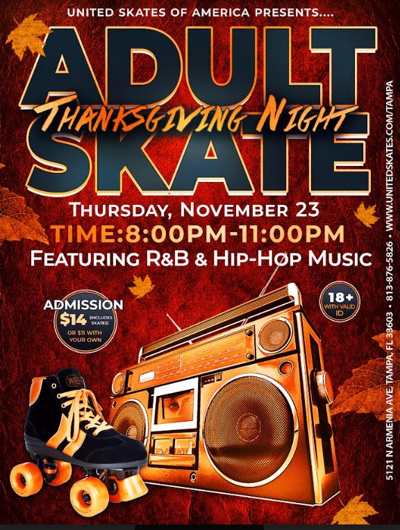 Our Annual Thanksgiving Night Soul Roll Returns! Come Skate Your Turkey Off With DJ Redex! Featuring Skating To The Best R & B, Hip Hop, House & More! Admission $14 (includes skates) or $11 with your own Ages 18 & older only