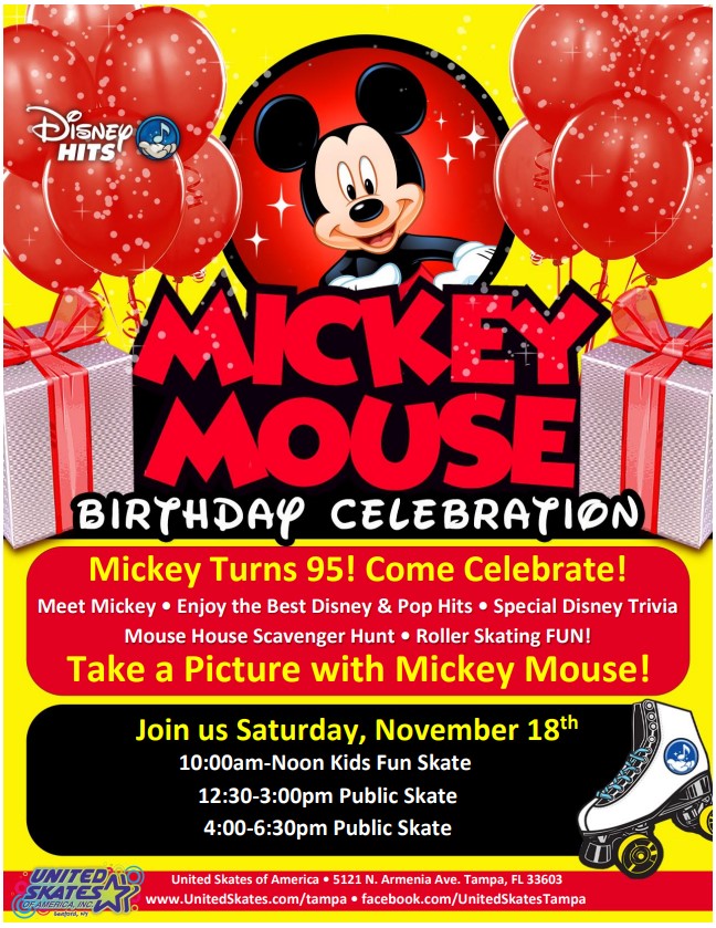 Mickey Mouse Turns 95 and We're Celebrating! 10:00am - 12:00pm ONLY Admission $10.00 (Includes regular skate rental) Recommended for Ages 10 years and younger & parents Radio Disney Music Birthday parties available on this session with advance reservation 12:30pm - 3:00pm, 4:00pm - 6:30pm Admission $14.00 each session (includes regular skate rental)