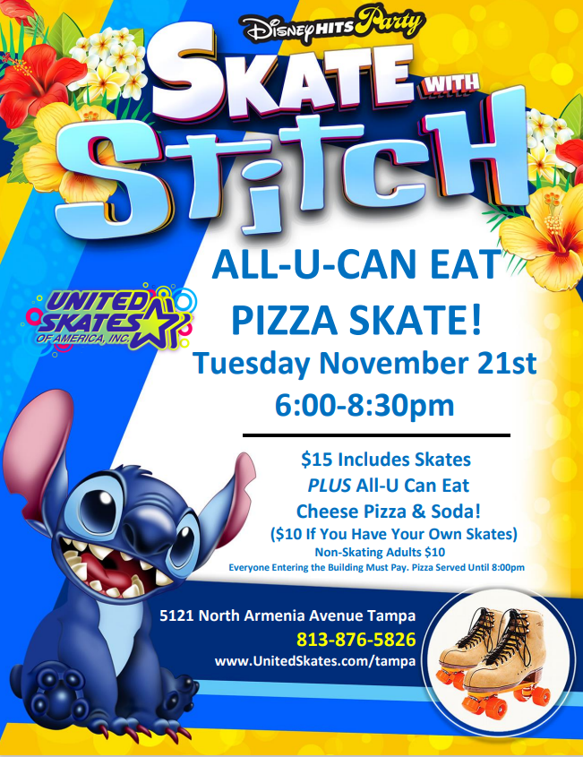 Public Skating Fun For All Ages Featuring Stitch! $14 per person (includes skates) or $11 with your own Family Of Four Just $60 - Includes 4 Admissions, 4 Rentals, Plus A Large 1-Topping Pizza & Pitcher Of Soda! (At least one parent must participate) Birthday Parties Available With Advance Reservation