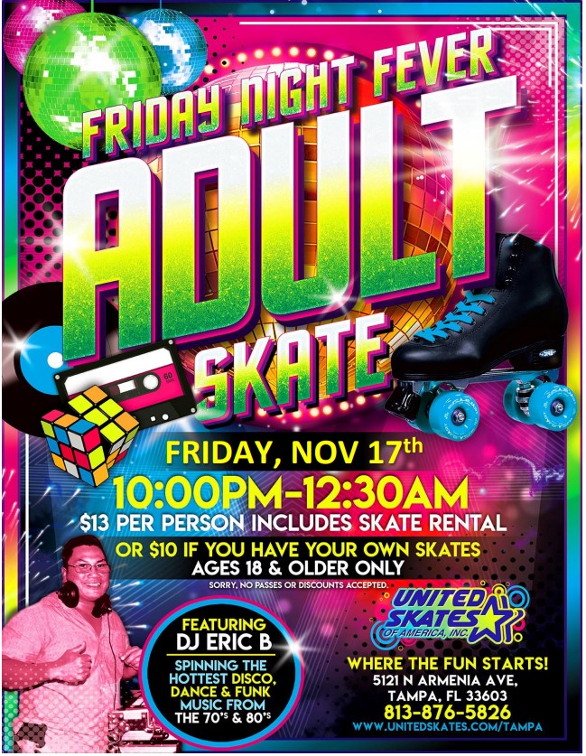 8:00PM – BEGINNER SKATERS Perfect if you’re somewhat new to skating, or you’d like some additional instruction $15 per person (includes 1/2-hour lesson, followed by our Newbie Night Adult Skate) 18 & older only