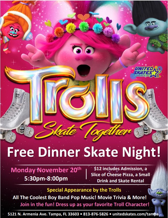 The Trolls Are Here For A Free Dinner Skate Featuring Top 40 and 90's Boy Band Music Admission $12 per person - Includes skate rental, plus a free slice of cheese pizza & small soda Birthday Parties available with advance reservation