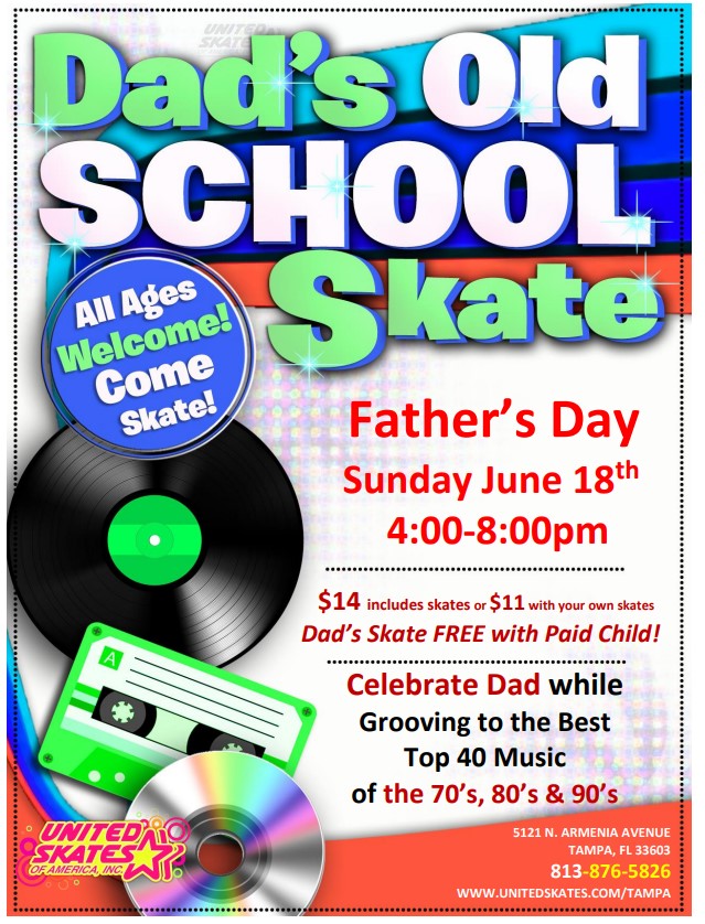We're Celebrating Dad's With Skating To The Best Music From The 70's 80's and 90's $14.00 per person (includes skates) or $11.00 with your own skates Dad's Skate FREE With Child's Full Paid Admission