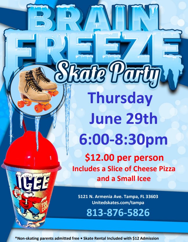 It's Summer Skating Fun Starring Everyone's Favorite Frozen Drink, ICEE! Admission $12 per person - includes skate rental if needed, plus a slice of cheese pizza and 12oz ICEE Non-skating parents admitted free.
