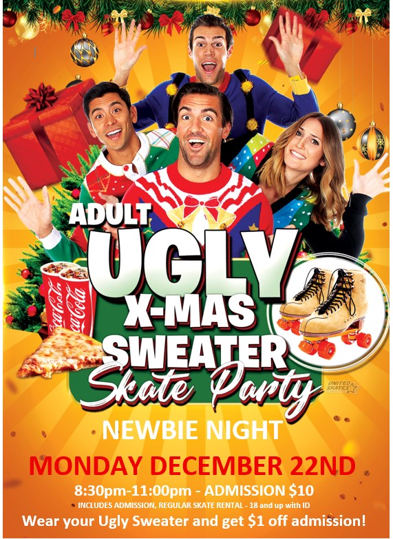 Break Out Your Favorite Ugly Sweater For Our Newbie Night Holiday Special! $10 per person (includes skate rental) $15 per person includes lesson at 8:00pm Save $1.00 off admission if […]