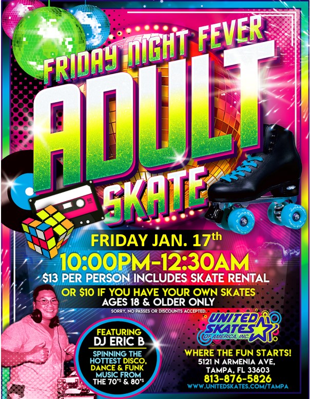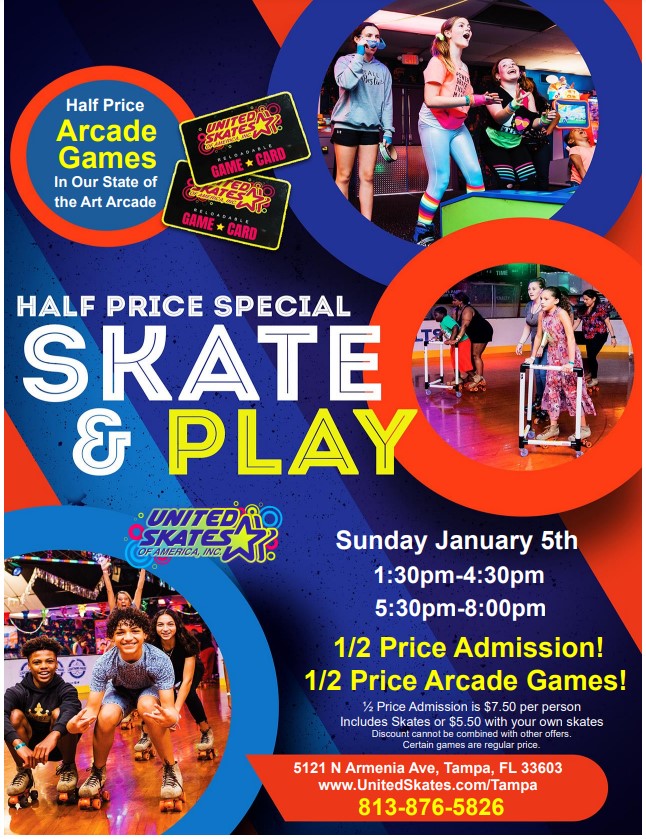It's The Last Day Of Winter Break, So Before Heading Back To School Come Enjoy Half Price Admission And Half Price Arcade Games! Half Price Admission Is $7.50 per person (includes skates) or $5.50 with your own skates Featuring Family-Friendly Top 40 Music Birthday parties available with advance reservation