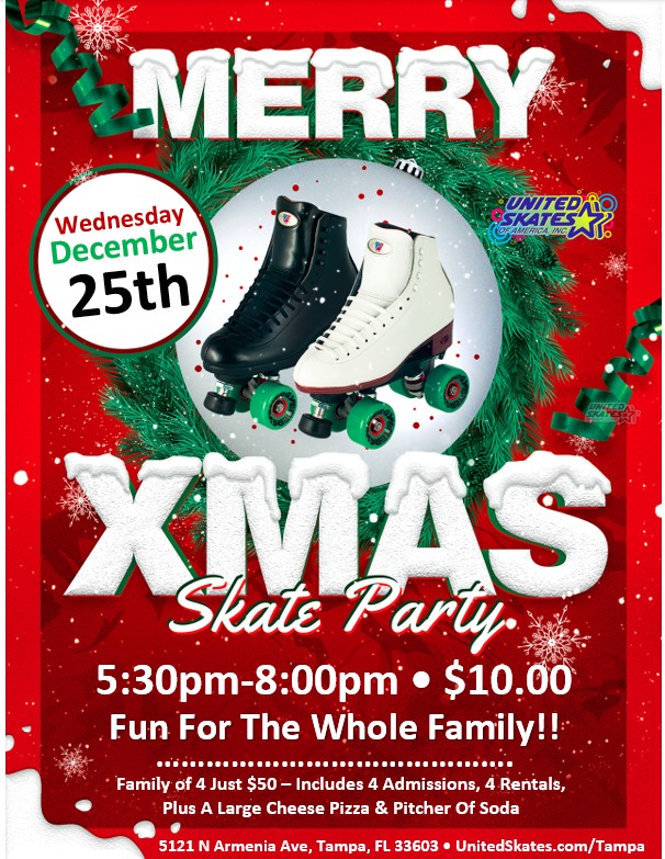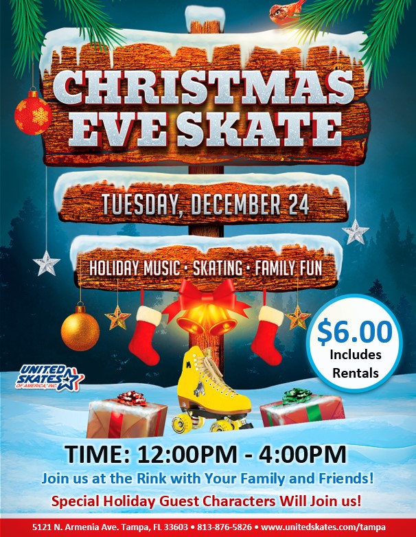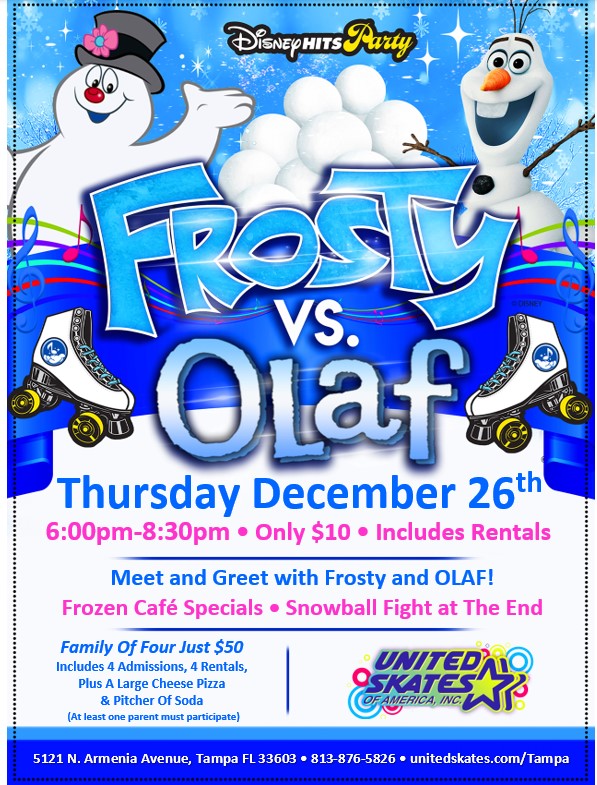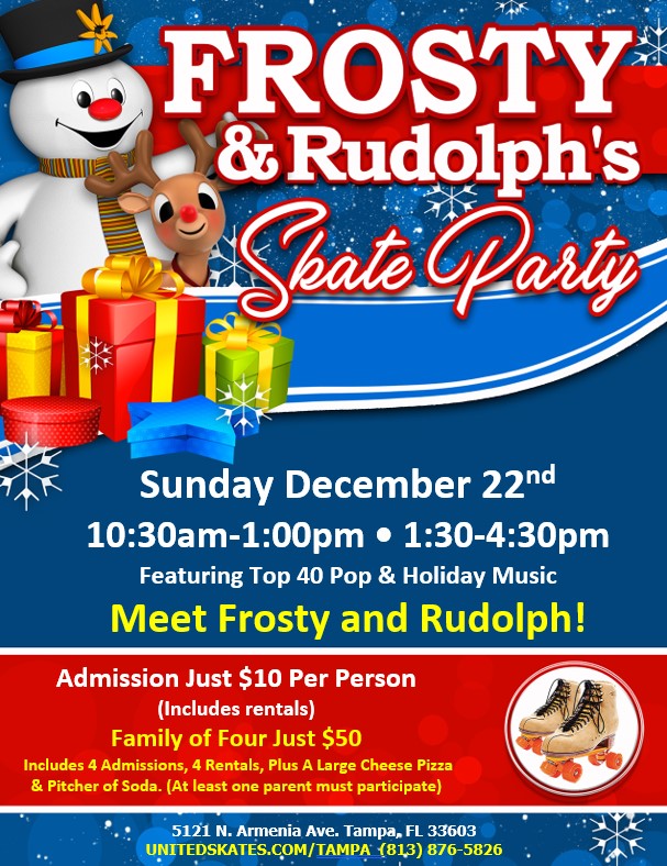 It's A Sunday Holiday Special! Featuring Appearances By Frosty and Rudolph! Top 40 Pop and Holiday Music Special Admission Price Just $10 Per Person (includes rentals) FAMILY OF FOUR JUST $50 - Includes four admissions, four rentals, plus a large cheese pizza & pitcher of soda (at least one parent must participate)