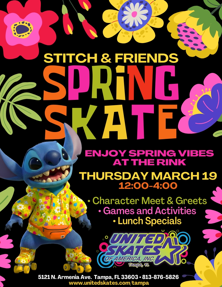 He's One Of Our Favorite Characters, And He's Here For Spring Break! Join Stitch and His Friends for skating fun Featuring pop music Admission $13 (includes rentals) or $10 with your own skates Non-skating parents are free Birthday parties available with advance reservation All guests must complete our online waiver prior to entry