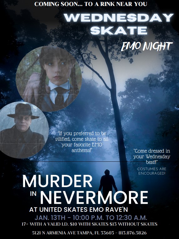 Friday The 13th Wednesday EMO Skate Jan 13 Friday The 13th Wednesday EMO Skate January 13, 2023 @ 10:00 pm - 12:30 am