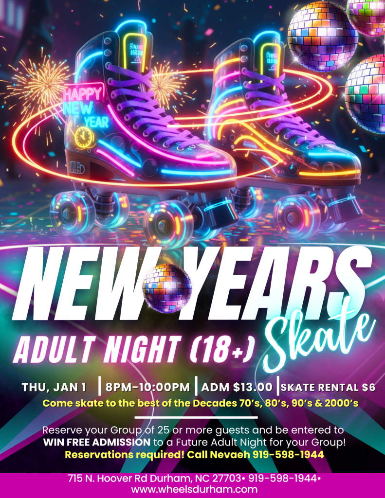 Ring in 2026 with an electrifying adults-only skate party on January 1st from 8–10 PM!