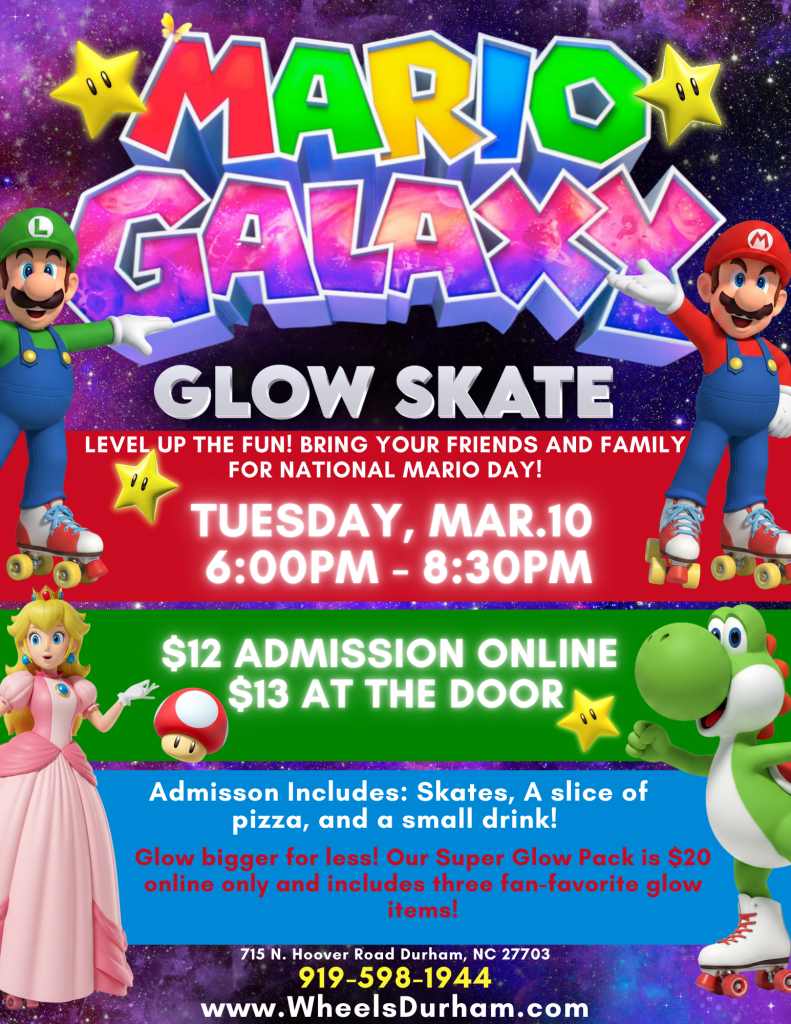 💥 Glow lights, epic music, and all your favorite Mario vibes! Bring your friends and family for a night of skating fun that’s out of this world 🌟
