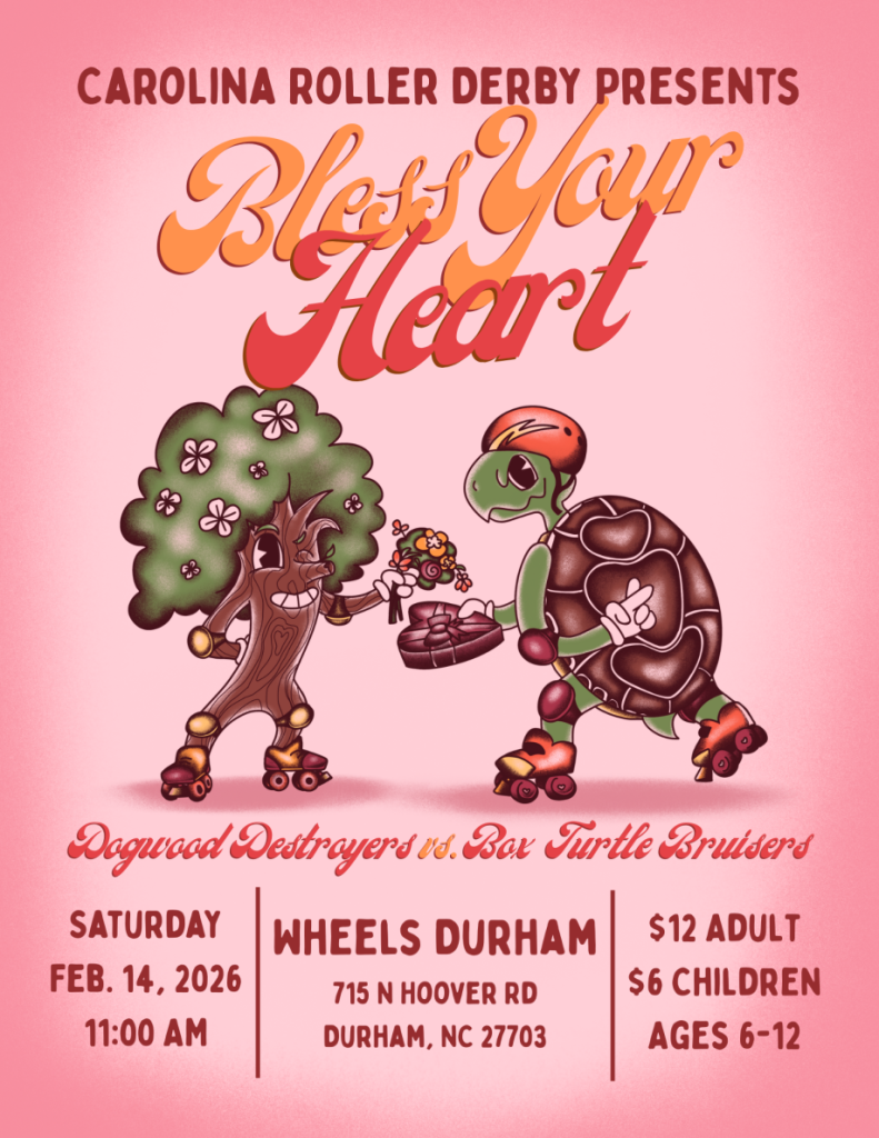 Carolina Roller Derby is bringing its “Bless Your Heart” bout to Wheels Durham on Saturday, February 14, 2026 at 11:00 AM. Watch the Dogwood Destroyers take on the Box Turtle Bruisers in a fun, family-friendly showdown.