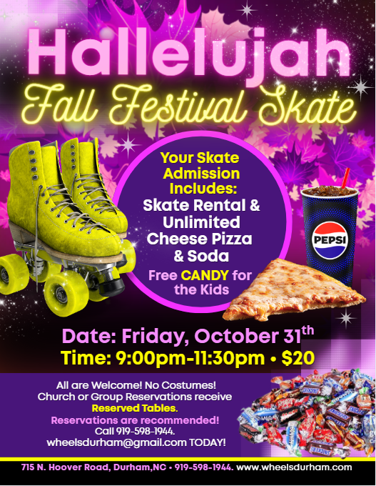 🍂 Hallelujah Fall Festival Skate Night 🍂 Join us for a joyful evening of skating, treats, and community fun—no costumes, just good vibes! 🛼 Friday, October 31st • 9:00–11:30 PM 📍 Wheels Skating Center – 715 N. Hoover Road, Durham, NC 🎟️ Admission: $20 (includes skate rental, unlimited cheese pizza & soda!) 🍬 Free candy […]