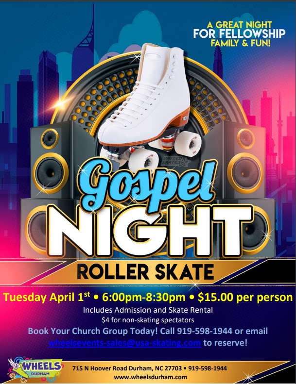 Gospel Skate Night Tuesday April 1st • 6:00pm-8:30pm • $15.00 per person Includes Admission and Skate Rental $4 for non-skating spectators