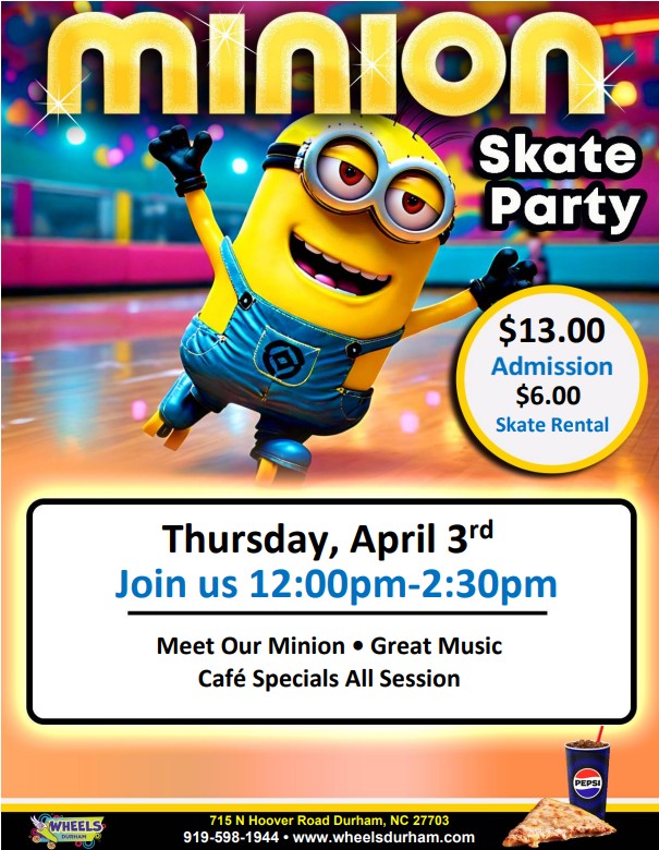 Thursday, April 3rd Join us 12:00pm-2:30pm Admission:13 Skate Rental: $6.00 Meet Our Minion and Enjoy Great Music Café Specials All Session