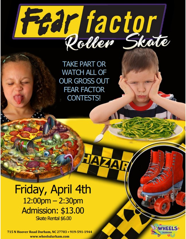 TAKE PART OR WATCH ALL OF OUR GROSS OUT FEAR FACTOR CONTESTS! Friday, April 4th 12:00pm – 2:30pm Admission: $13.00 Skate Rental $6.00