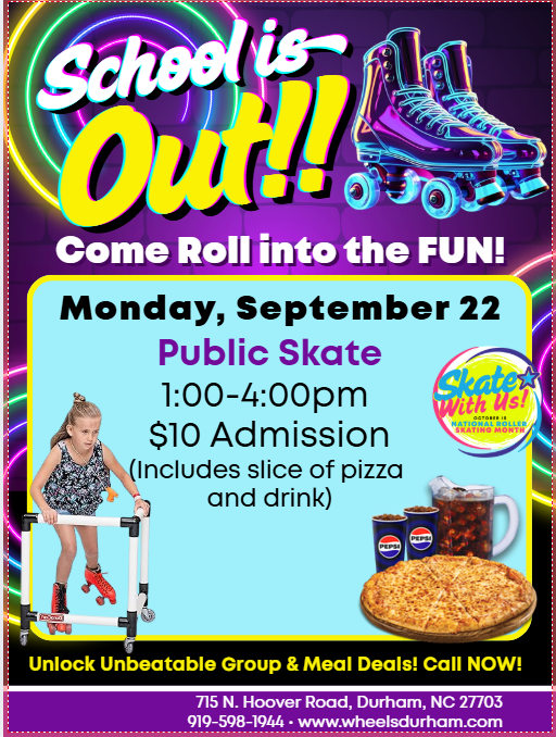 🛼 School’s Out Skate Party! 🍕 Monday, September 22 1:00–4:00pm Wheels Skating Center – Durham, NC No school? No problem! Roll into the FUN with an afternoon of skating, music, and tasty treats. Whether you're gliding solo or bringing the whole crew, this is the perfect way to kick off your day off. 🎉 What’s […]