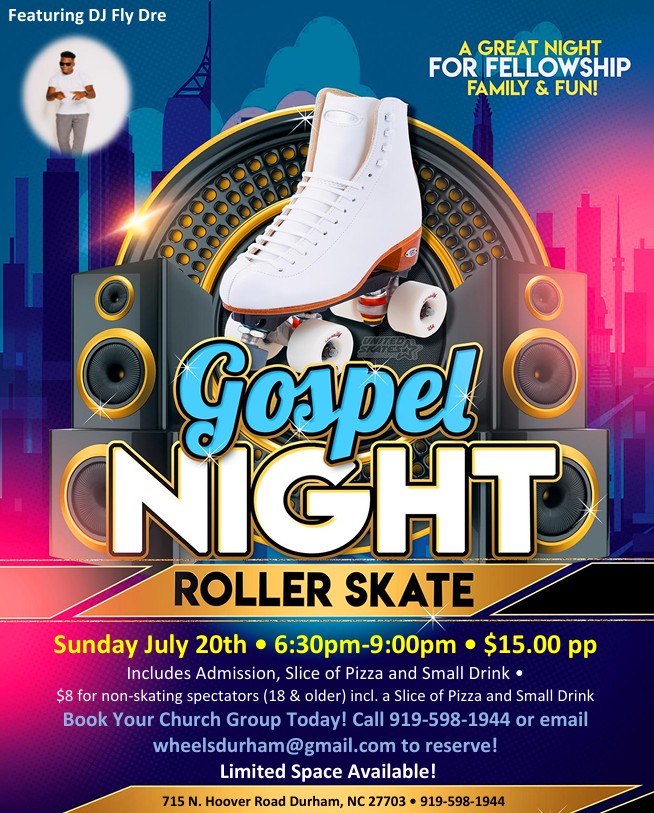🙌🛼 Gospel Night Roller Skate with DJ Fly Dre! 🎶🍕 Sunday, July 20 6:30PM–9:00PM Celebrate faith, family, and fellowship at Wheels Skating Center with an evening full of uplifting beats and delicious treats! 🎧 Featuring DJ Fly Dre – Bringing the gospel and inspiration to the rink like never before! 🍕 Admission: $15.00 – Includes […]