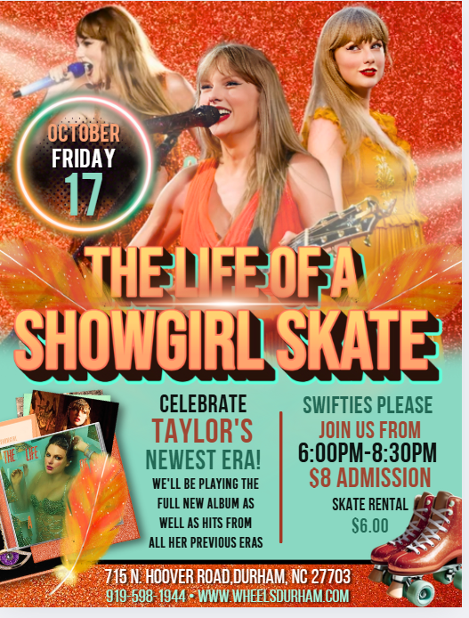 ✨ The Life of a Showgirl Skate 🎤 Friday, October 17 6:00–8:30pm Wheels Skating Center – Durham, NC Calling all Swifties! Step into the spotlight and skate through every era of Taylor Swift—from country curls to pop royalty. We’re spinning her entire new album plus iconic hits from every chapter of her career. Dress to […]