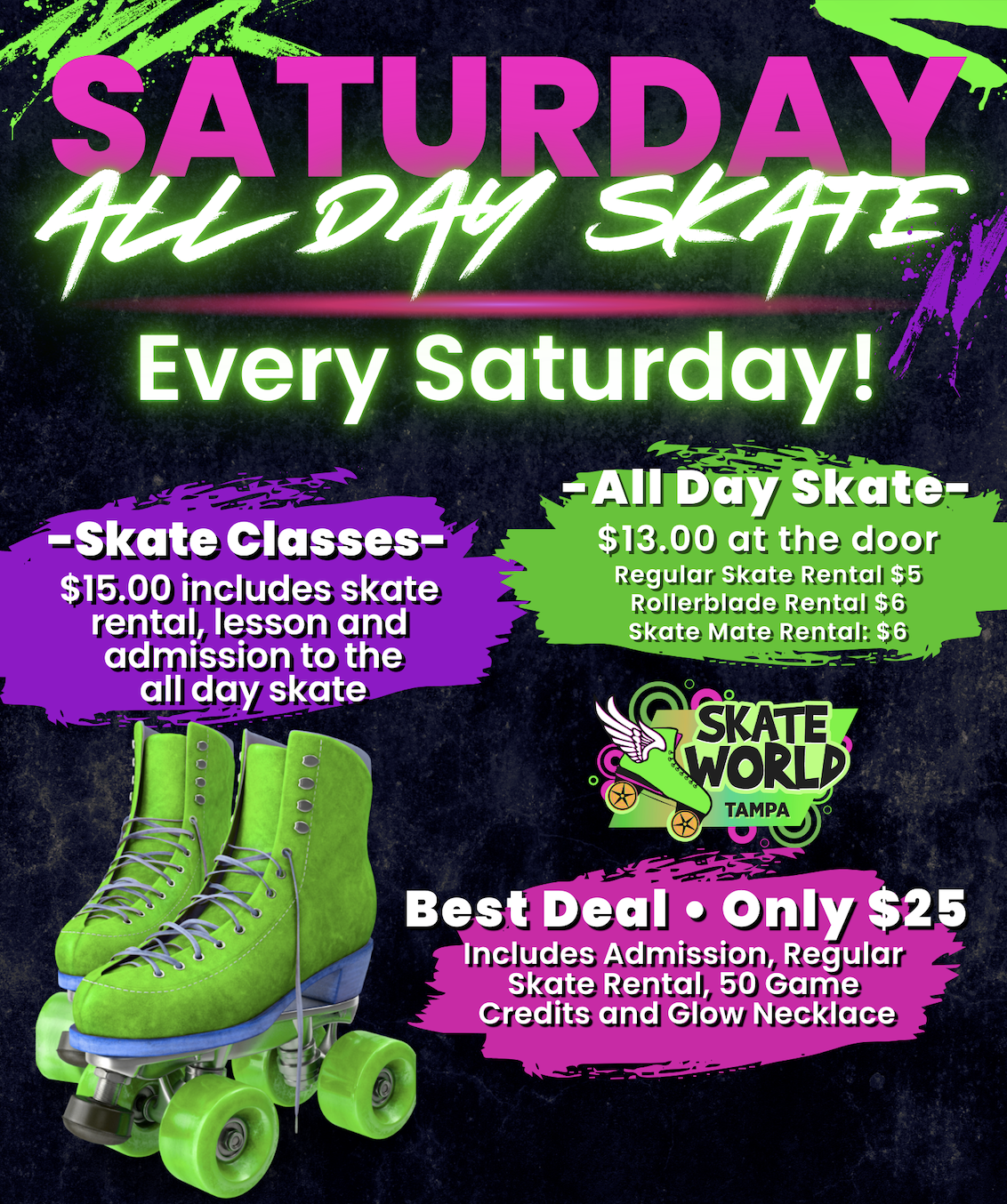 CLICK OR TAP HERE TO FILL OUT OUR WAIVER ALL GUESTS ENTERING THE FACILITY MUST FILL OUT A WAIVER $13.00 Admission Includes Regular Skate Rental $1.00 Rollerblade Rental Ages 18+ with […]