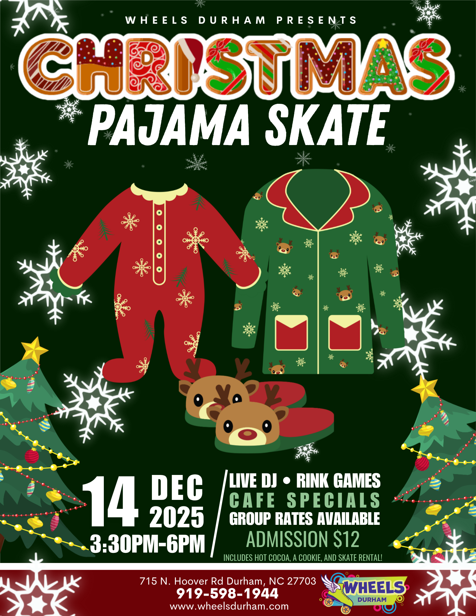 Fundraising Event for Smith Middle School -- Thursday Private Skate 6:00pm-8:30pm Thursday December, 4th from 6:00pm-8:30pm Regular Admission $15(Includes admission and skate rental) Wheels Durham has a Clear Bag Policy! All Guests ages 3 and up must pay an admission. All Sales are Final! Purchase Tickets Here!
