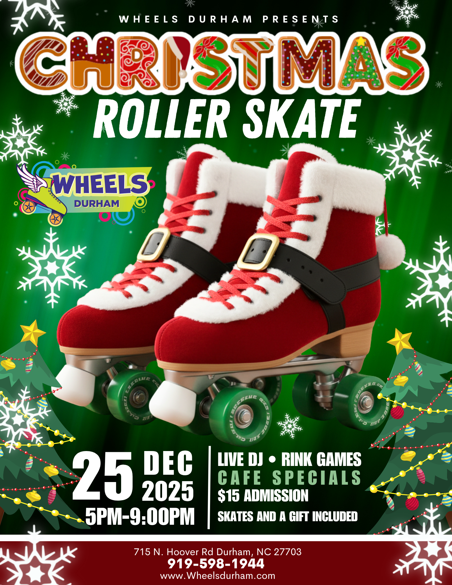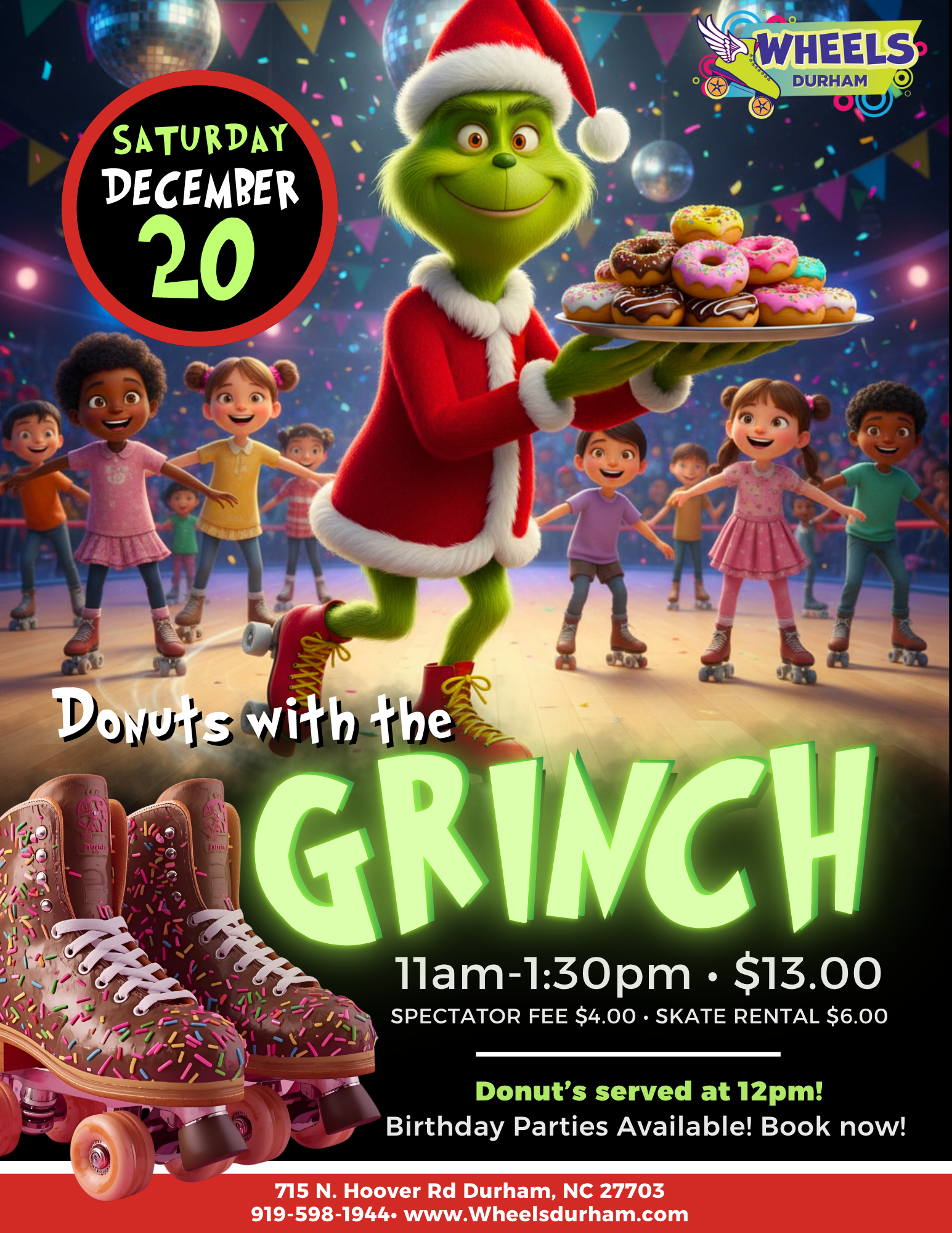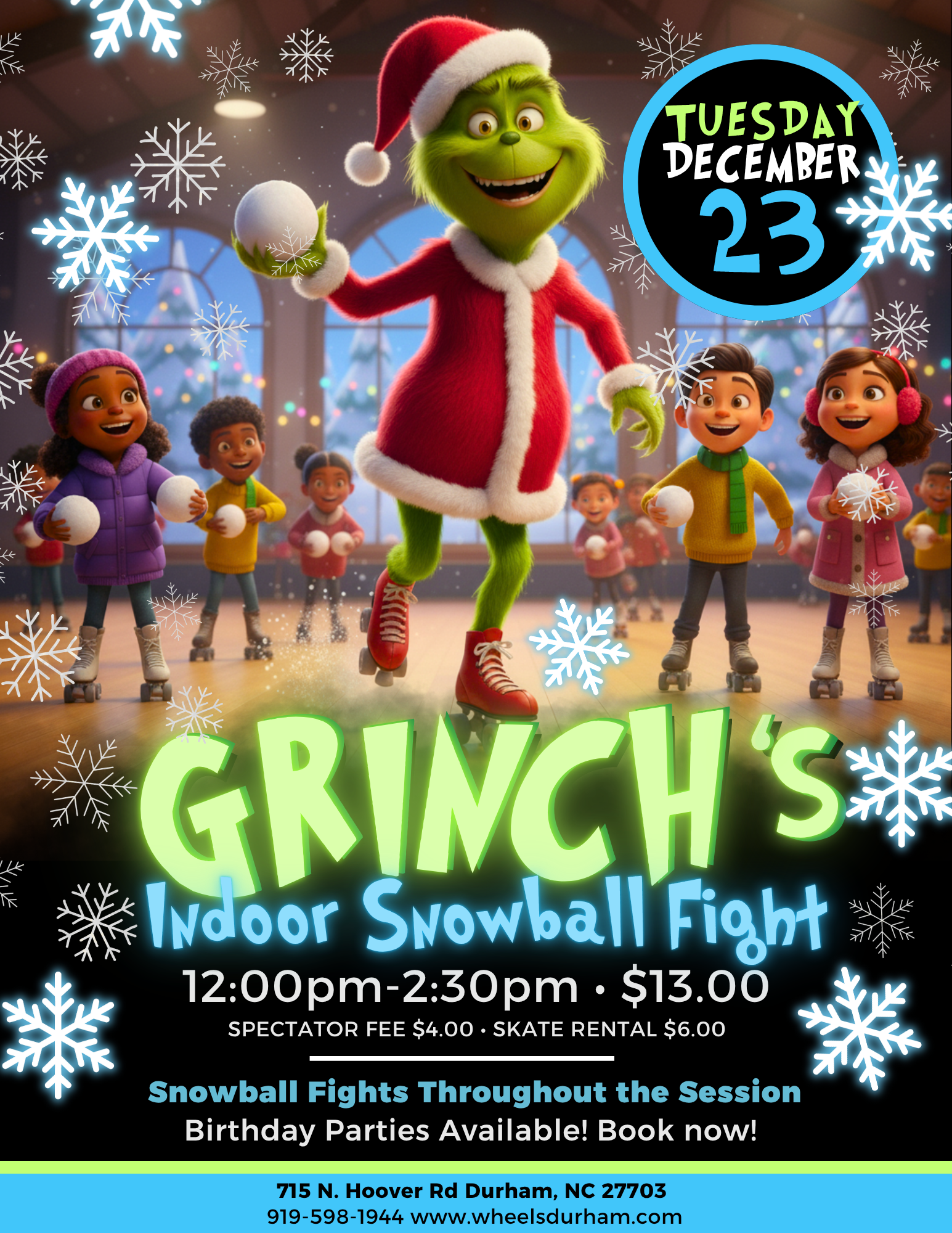 CLICK OR TAP HERE TO FILL OUT OUR WAIVER He’s mean, he’s green, and he’s ready to roll! Join us for a Grinch-themed skate day filled with fun, music, and sweet treats! 💚 🎟 $13.00 Regular Admission🛼 $6.00 Regular Skate Rental🛼 $7.00 Rollerblade Rental🛼 $6.00 Skatemate Rental👀 $4.00 Spectator Admission (Non-skating chaperones 18+) 🍩 Enjoy […]