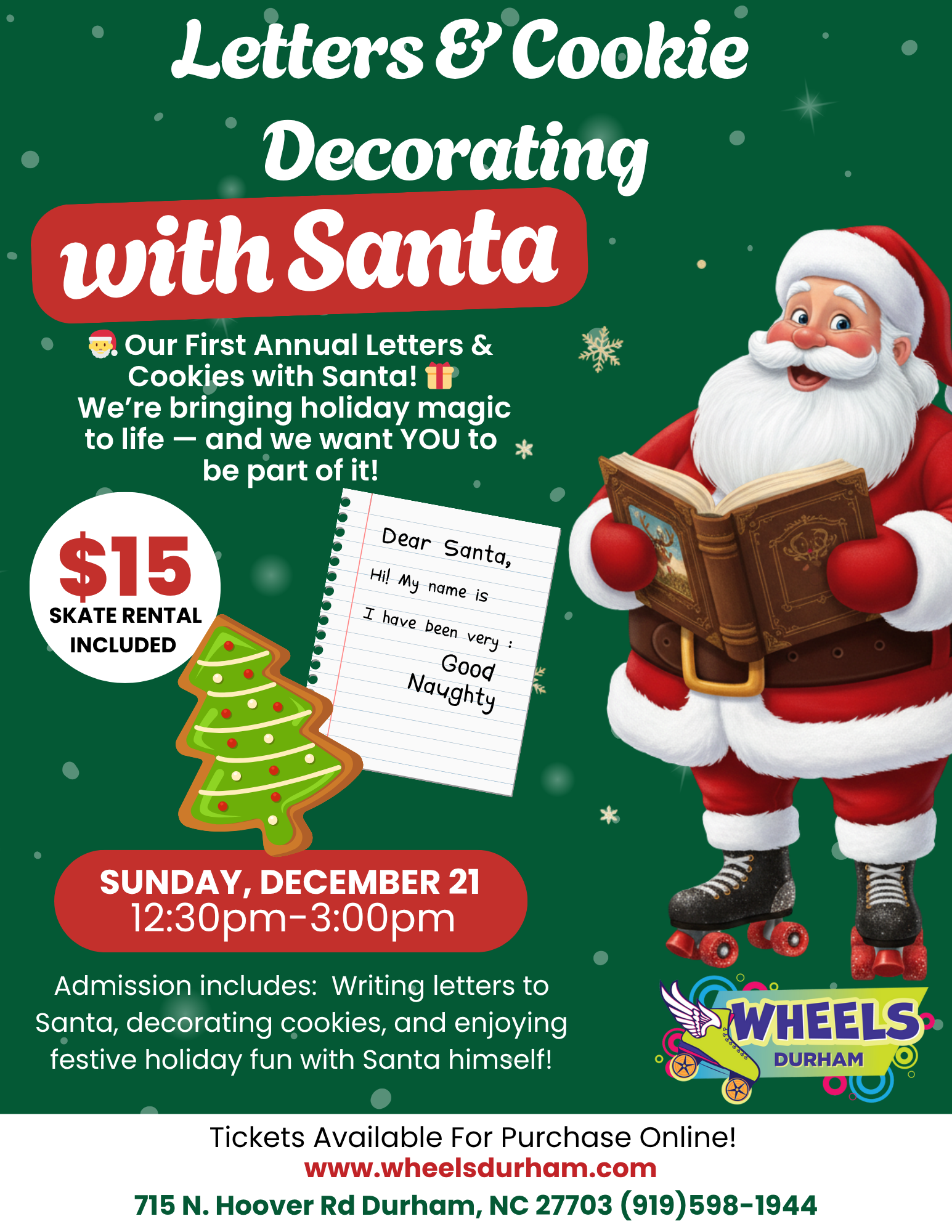 CLICK OR TAP HERE TO FILL OUT OUR WAIVER ALL GUESTS ENTERING THE FACILITY MUST FILL OUT A WAIVER 🍪 $15 Admission – Skate Rental Included! $6.00 Skate Mates $4.00 Spectator Admission for non-skating chaperones 18+ 💌 Writing letters to Santa🍪 Decorating yummy cookies🎄 Enjoying festive holiday fun with Santa himself! Purchase Tickets Here!