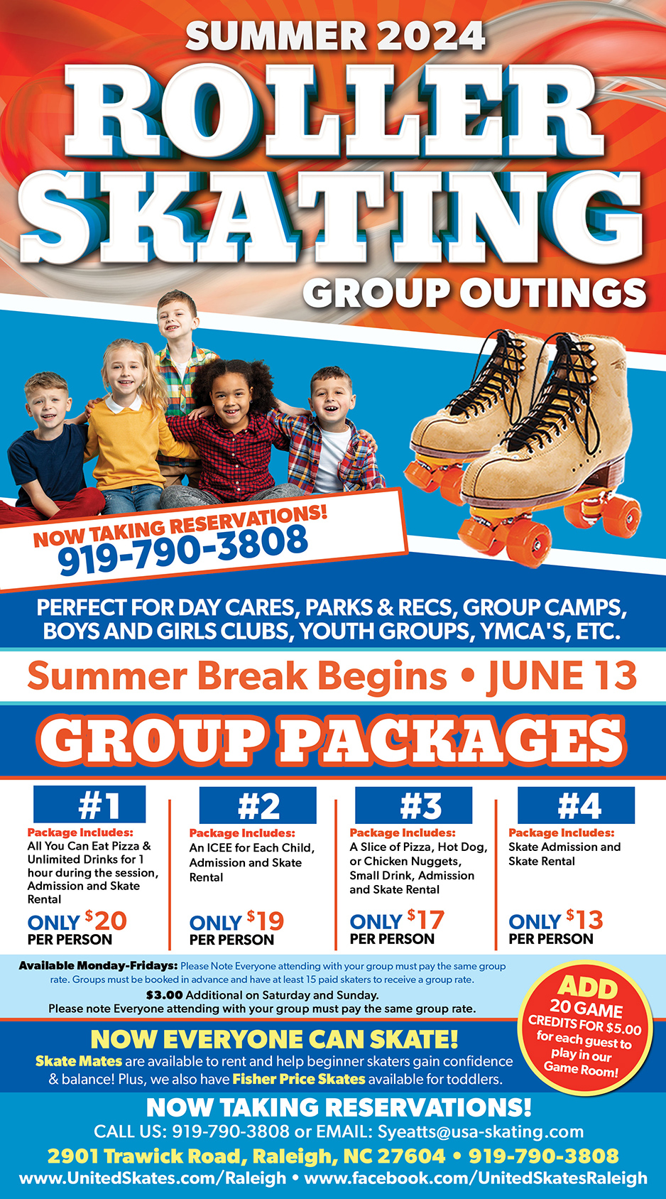 Get amazing group rates for camps, day cares, youth clubs, church groups, after school programs, parks and recreation programs, and more! Schedule a day out and get great discounted group rates and an all-inclusive experience. Advance booking for groups required.