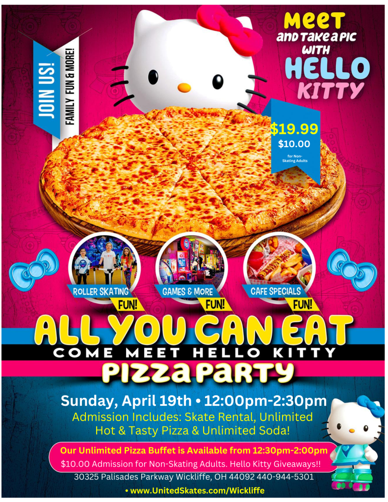 Get ready for the sweetest skating party ever! Join us for a fun-filled afternoon of skating, games, and unlimited hot, cheesy pizza — plus a chance to meet and take photos with Hello Kitty! 💕