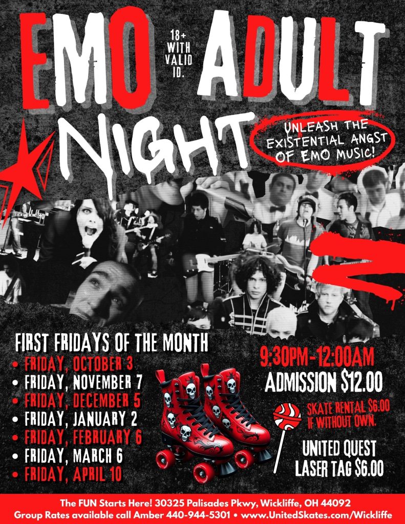 Get ready to relive the glory days of eyeliner, heartbreak anthems, and skatin’ through all the emotions — because Emo Adult Skate Nights are rolling in every Friday starting October 3rd! 🎶💔🔥
