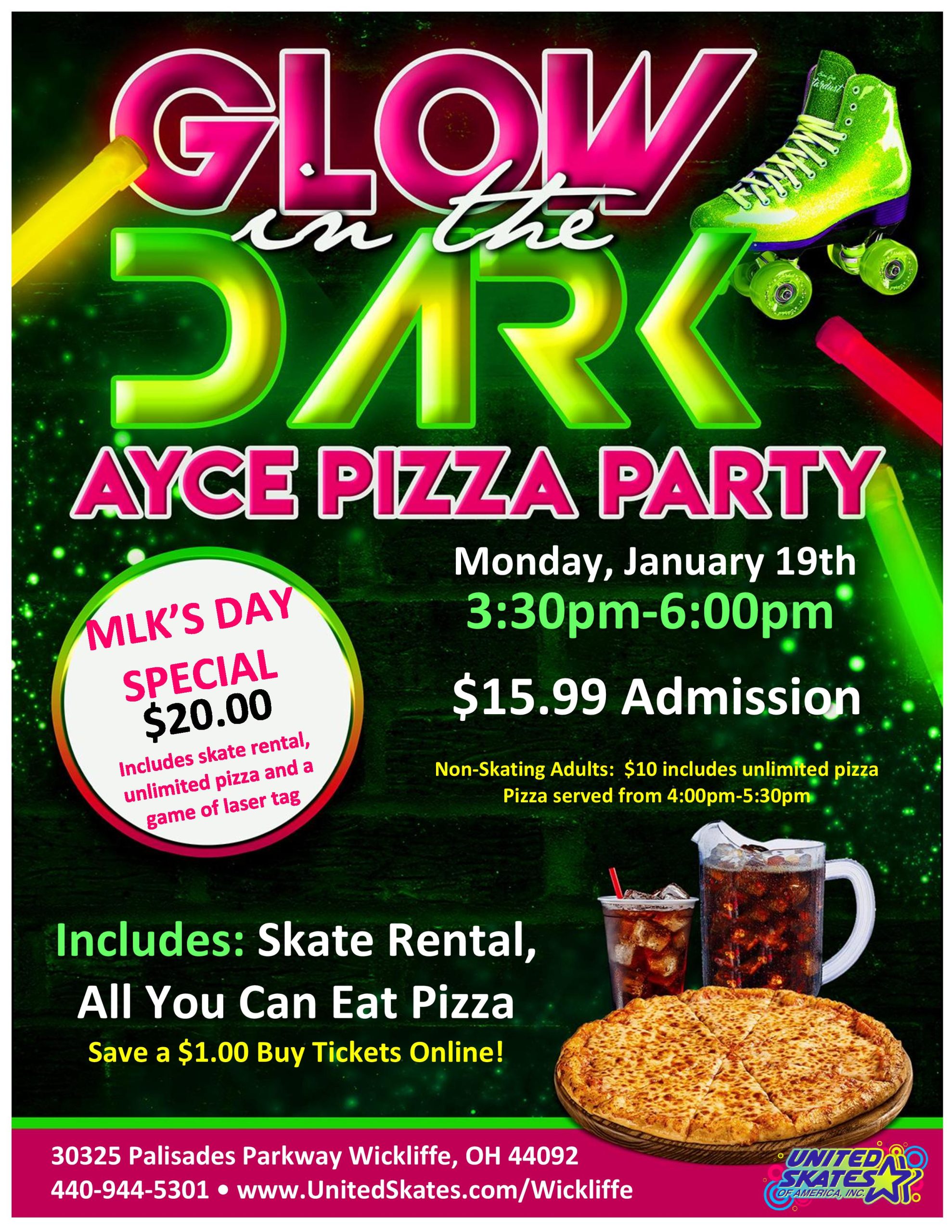 Get ready to skate, glow, and eat—all at the same time! Join us for a one-of-a-kind Glow in the Dark Pizza Skate and make your Monday afternoon unforgettable!