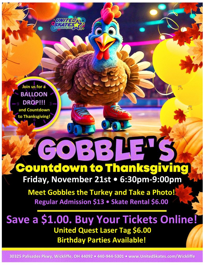 Thanksgiving is almost here, and Gobbles the Turkey is ready to kick off the countdown in style at United Skates of America! Bring the whole family for a festive day of skating, games, and fun you won’t want to miss.
