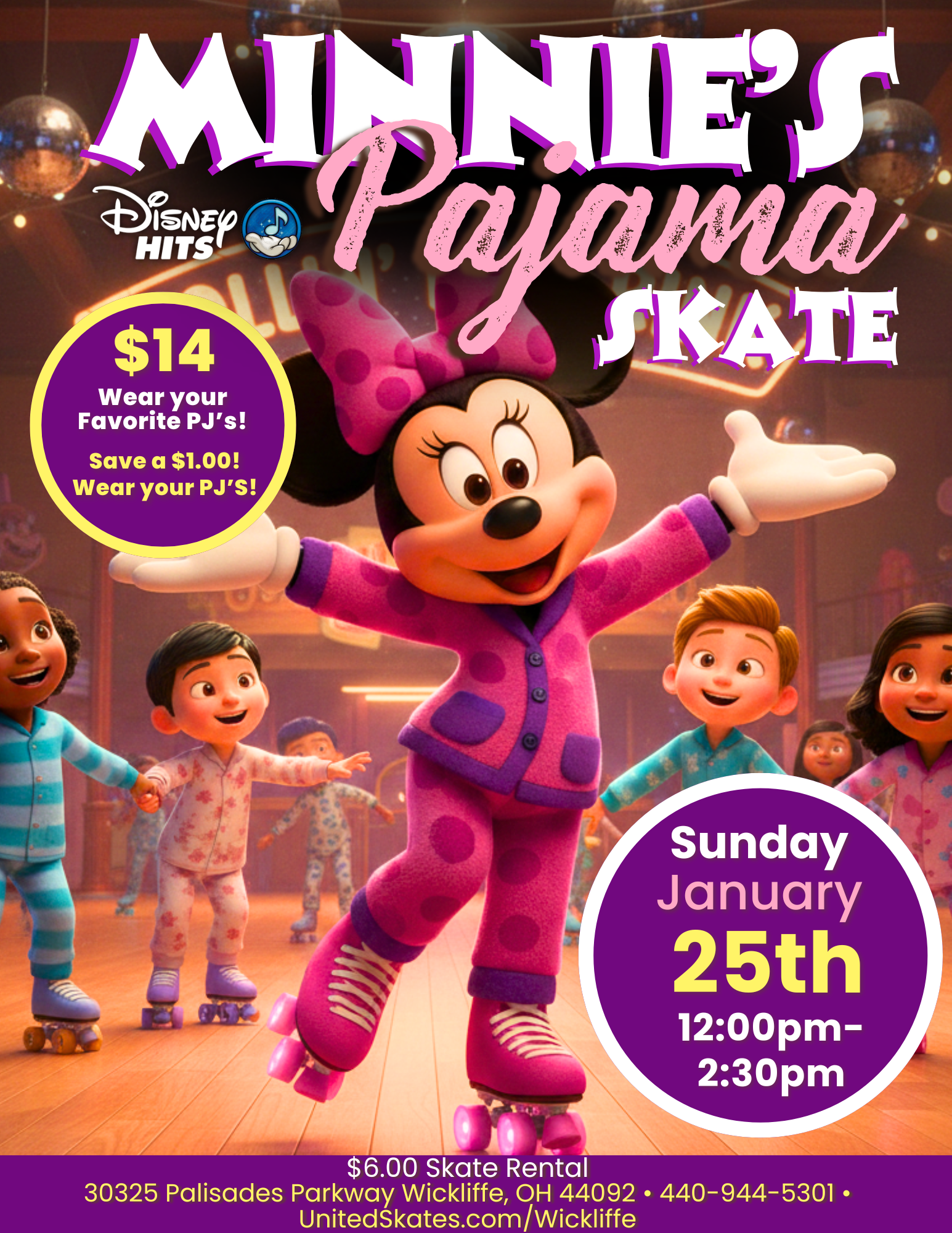Get ready to roll into a Sunday Funday like no other! Join us at United Skates for a pajama-themed skating adventure with Minnie Mouse herself. Come dressed in your favorite PJs and skate the afternoon away with fun, music, and lots of smiles!